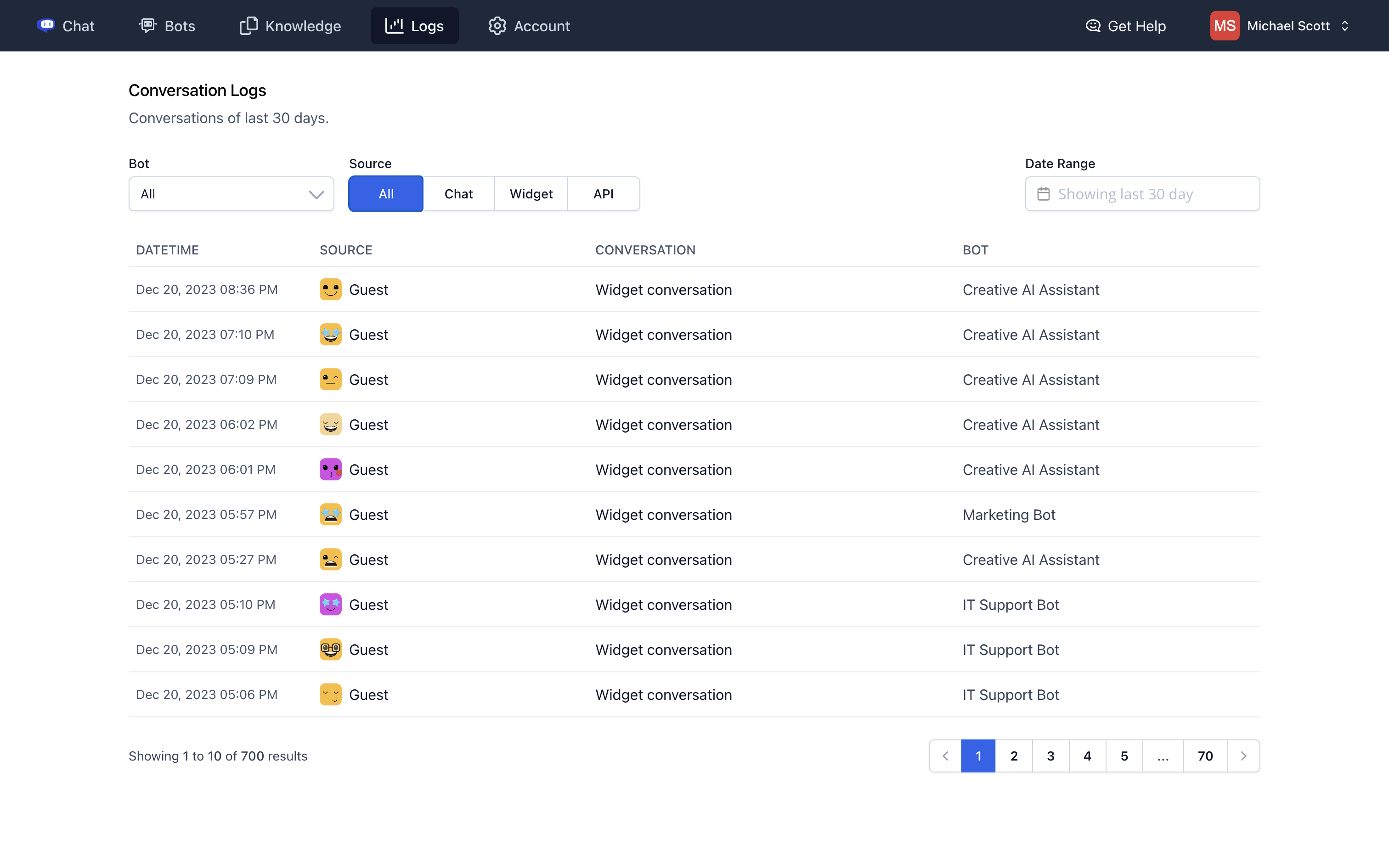 Monitor all interactions, whether through the interface, API, or widgets, in one centralised spot. Filter by bot or date range for quick, hassle-free access to key info.